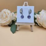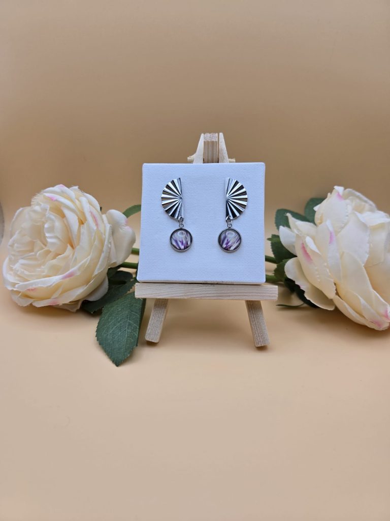 Réalisées en acier inoxydable argenté, elles présentent une demi-lune texturée retenant un cabochon en verre coloré aux reflets changeants.