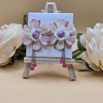 Les Fleurs Dansantes sont des boucles d’oreilles élégantes et poétiques : une fleur délicate en tissu, rehaussée d’un cœur perlé scintillant et de petites chaînes en acier ornées de perles en verre colorées.