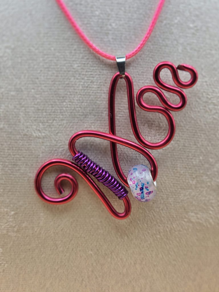Ce collier artisanal « Élégance Fuchsia » allie modernité et créativité. Réalisé en fil d’aluminium travaillé à la main, il est sublimé par une perle en verre aux reflets délicats. Léger et confortable, il se porte facilement au quotidien comme lors d’occasions spéciales.